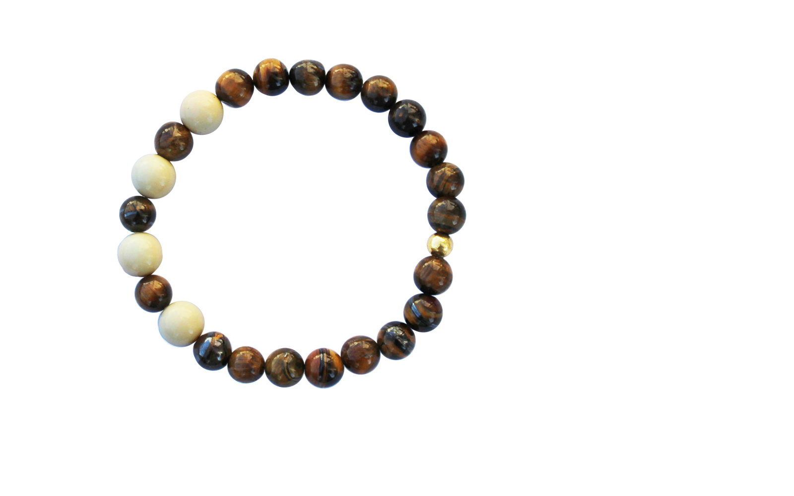 8mm tiger eye; 10mm ivory jade beads; gold finding