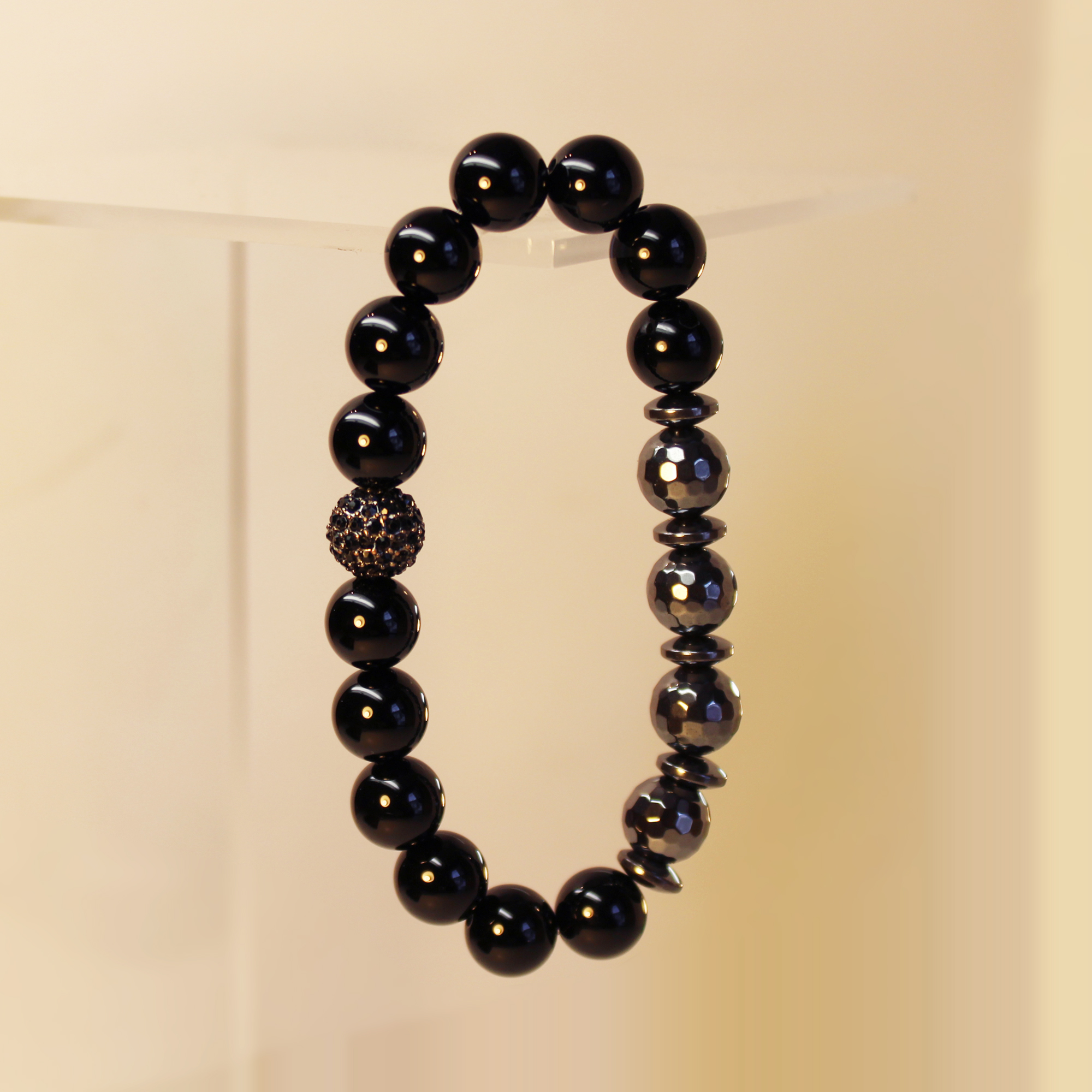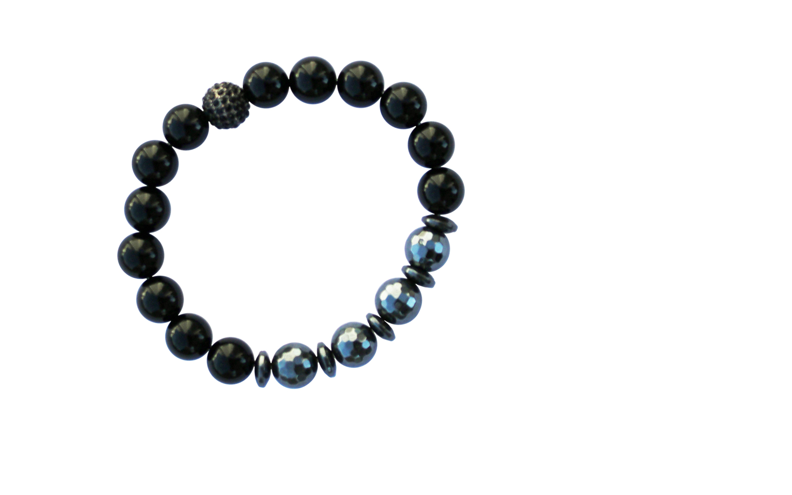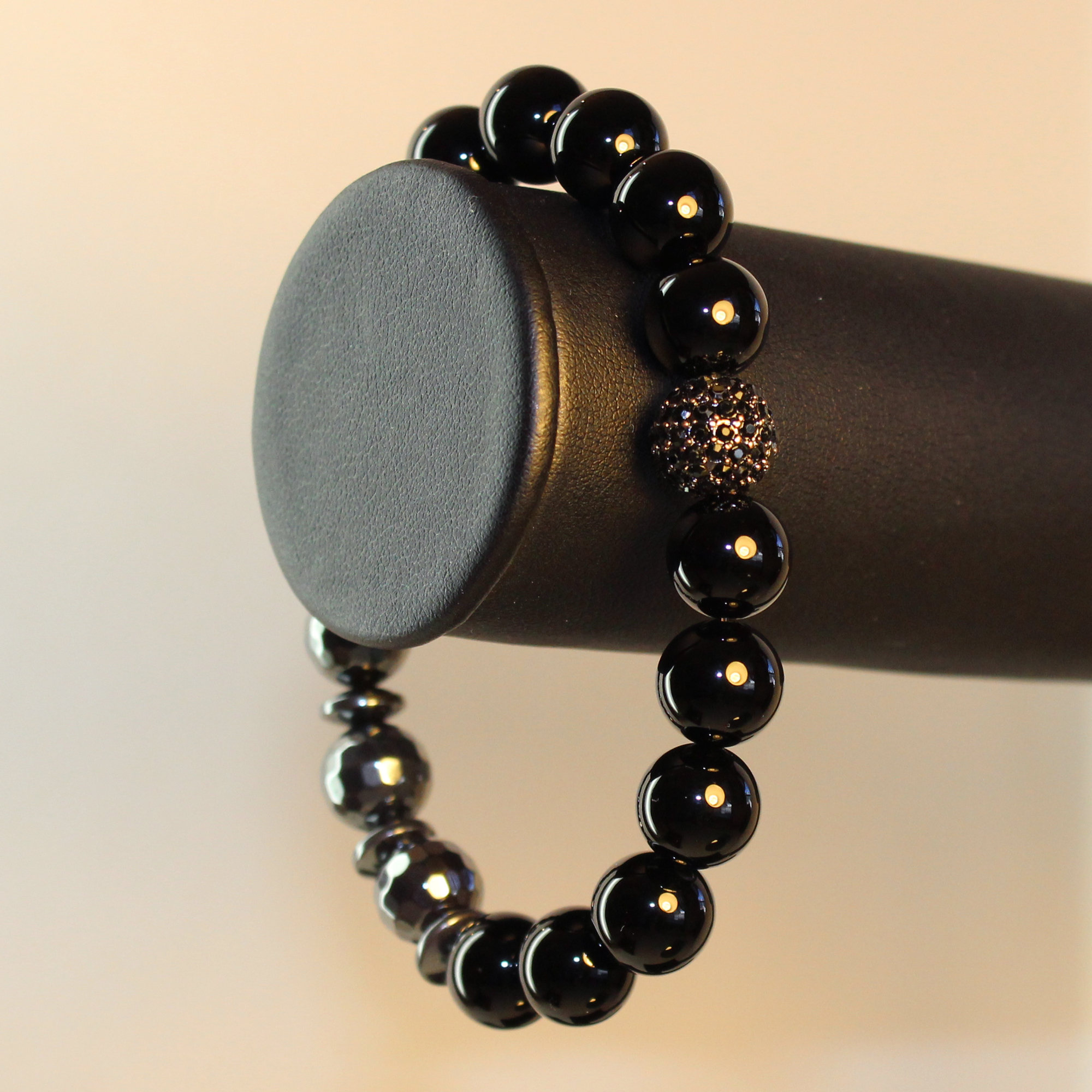 10mm black onyx, faceted hematite; hematite spacers; black pave bead.