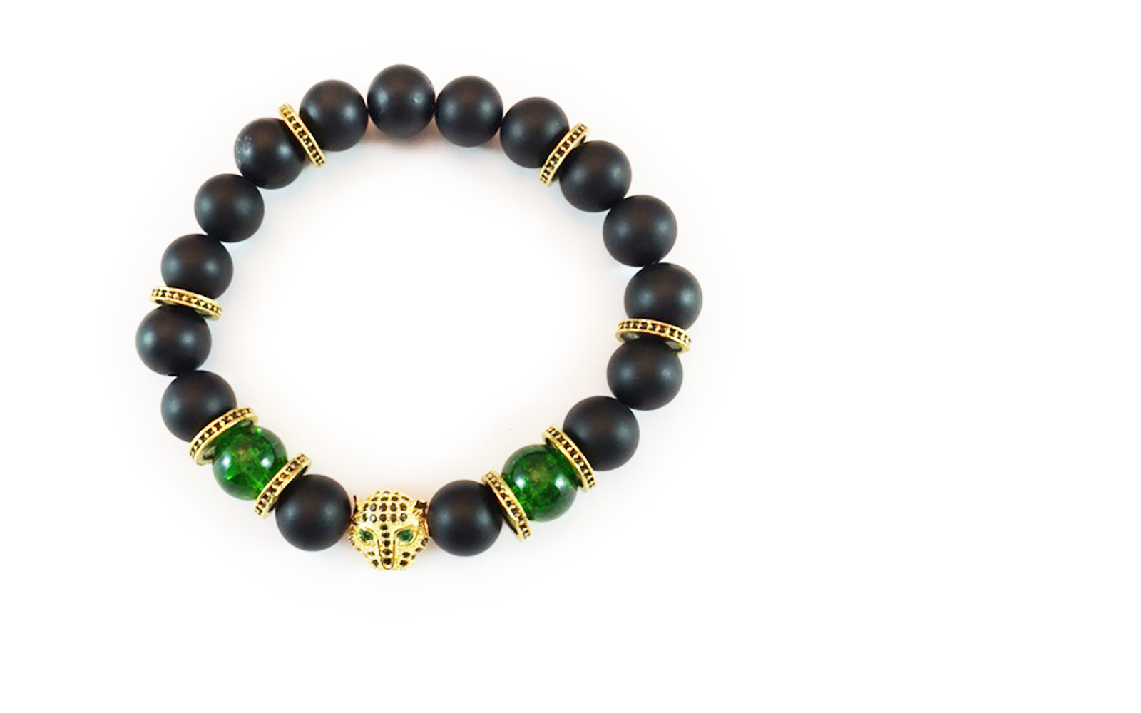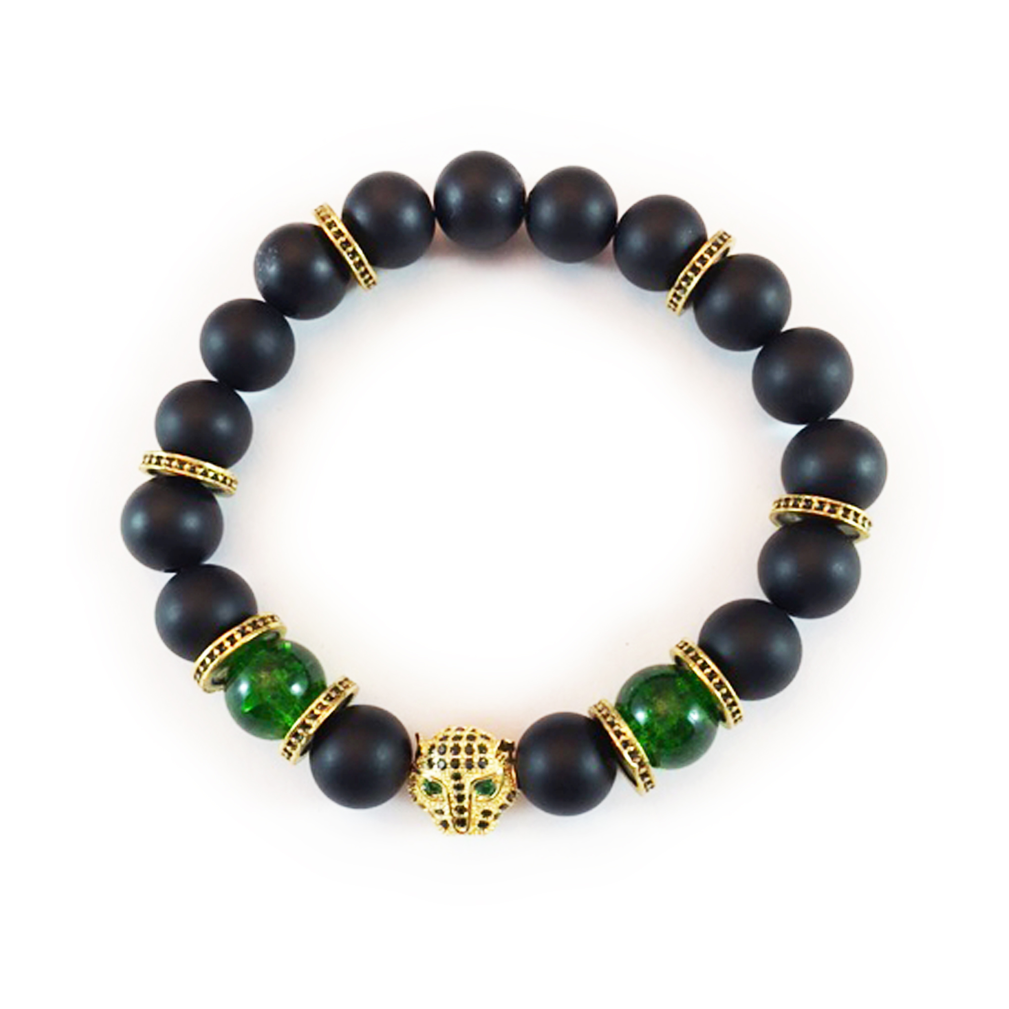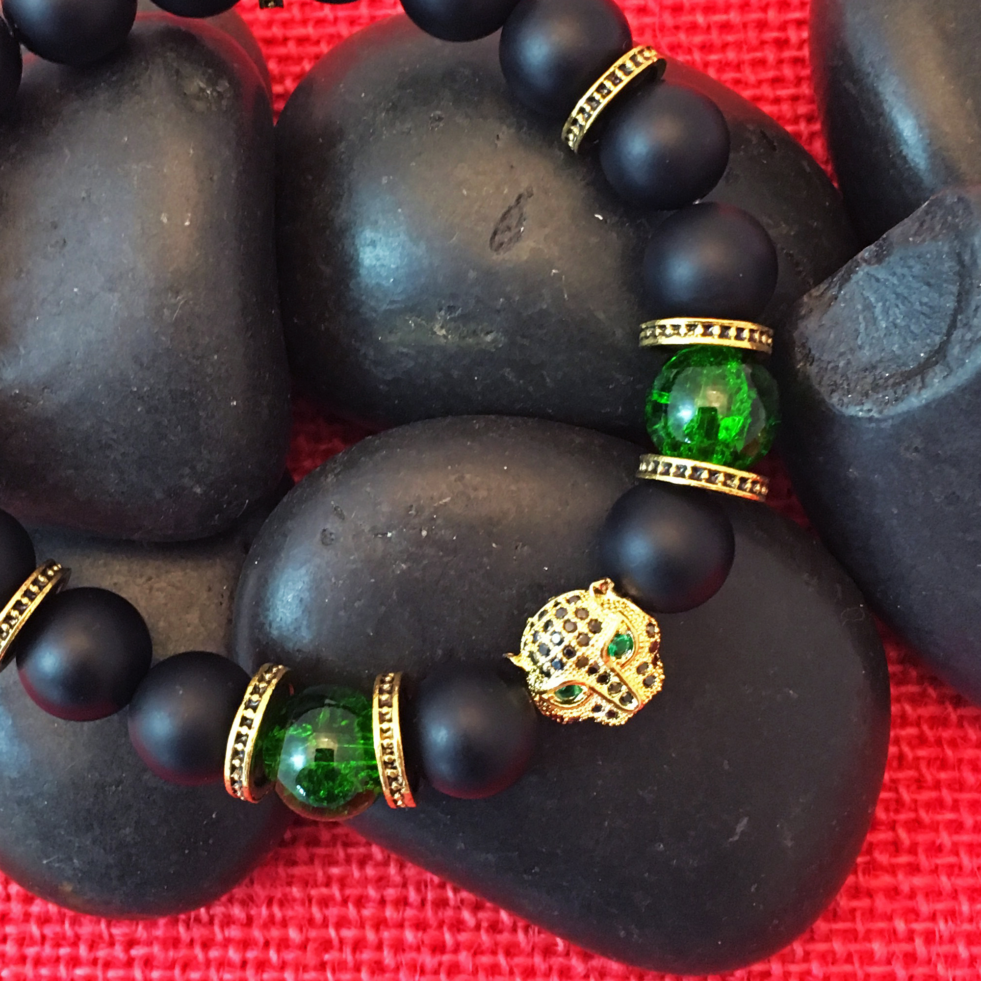 10mm black matte beads, emerald crackle beads, leopard lion head pave CZ charm bead.