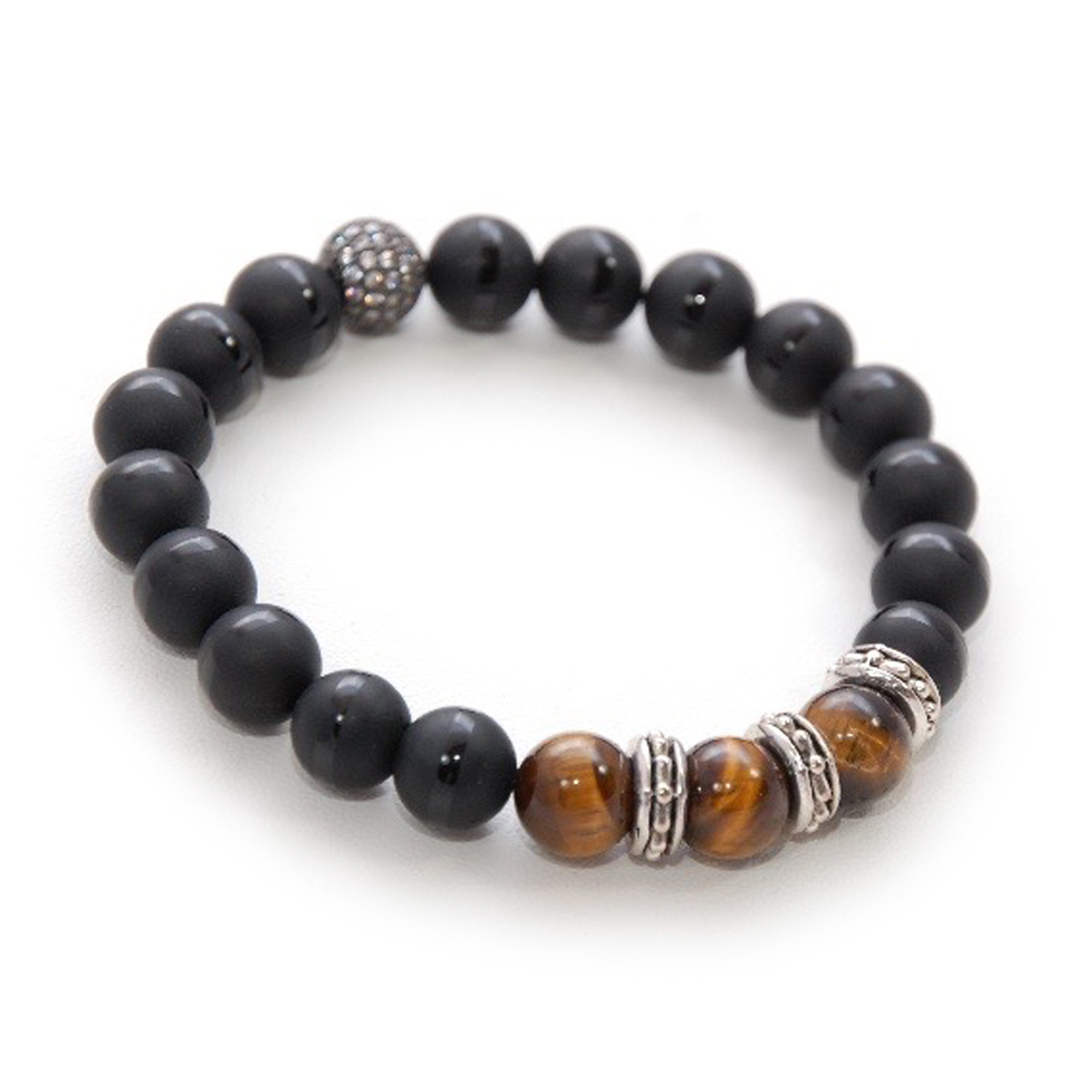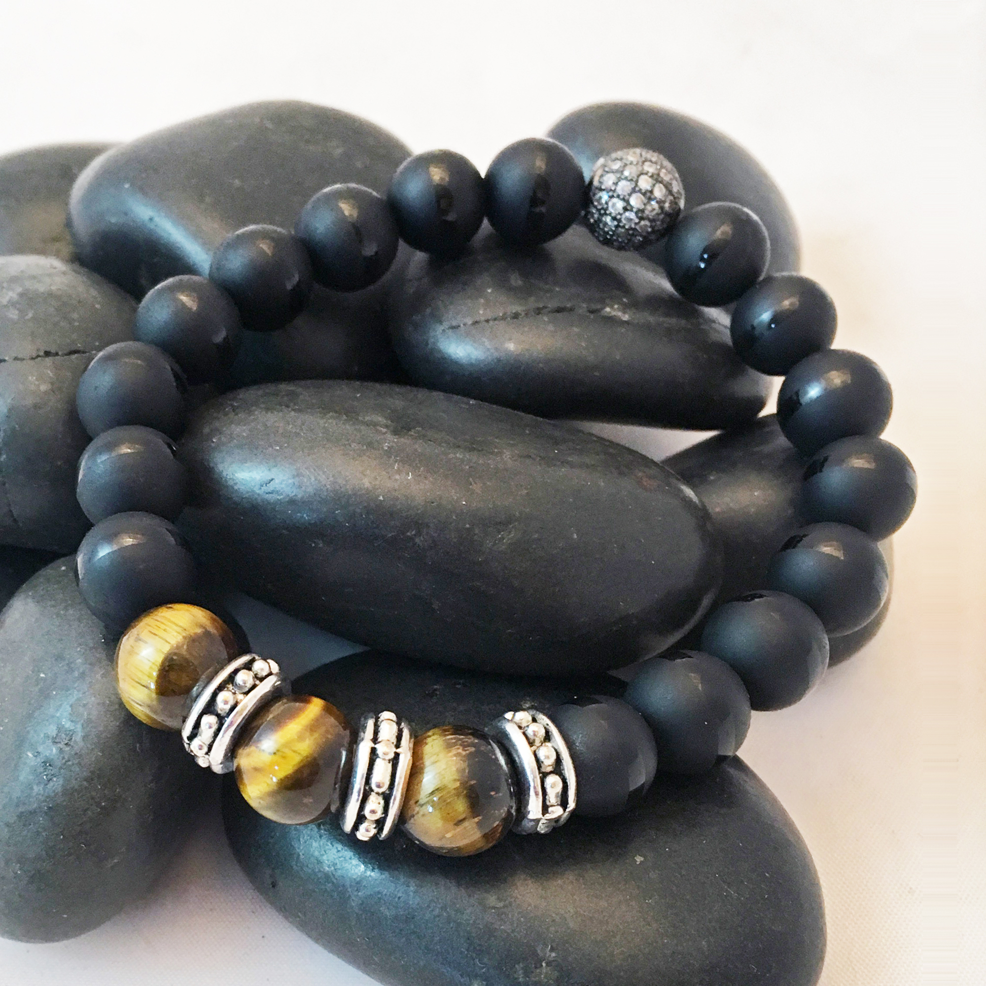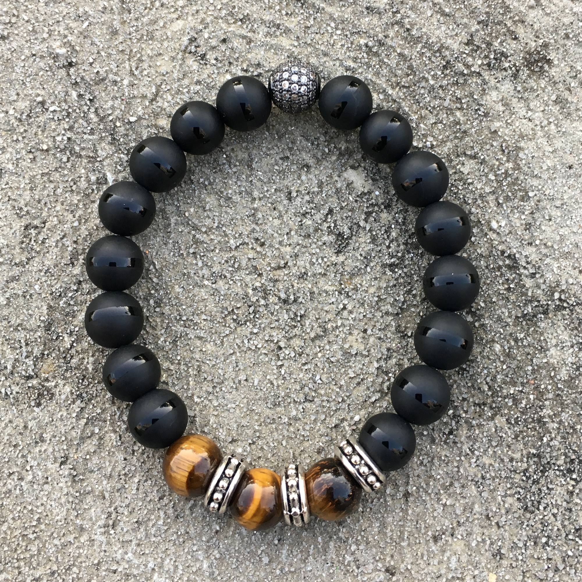 10mm matte onyx black stipe beads, tiger eye beads, 10mm micro pave CZ charm bead, silver spacers.