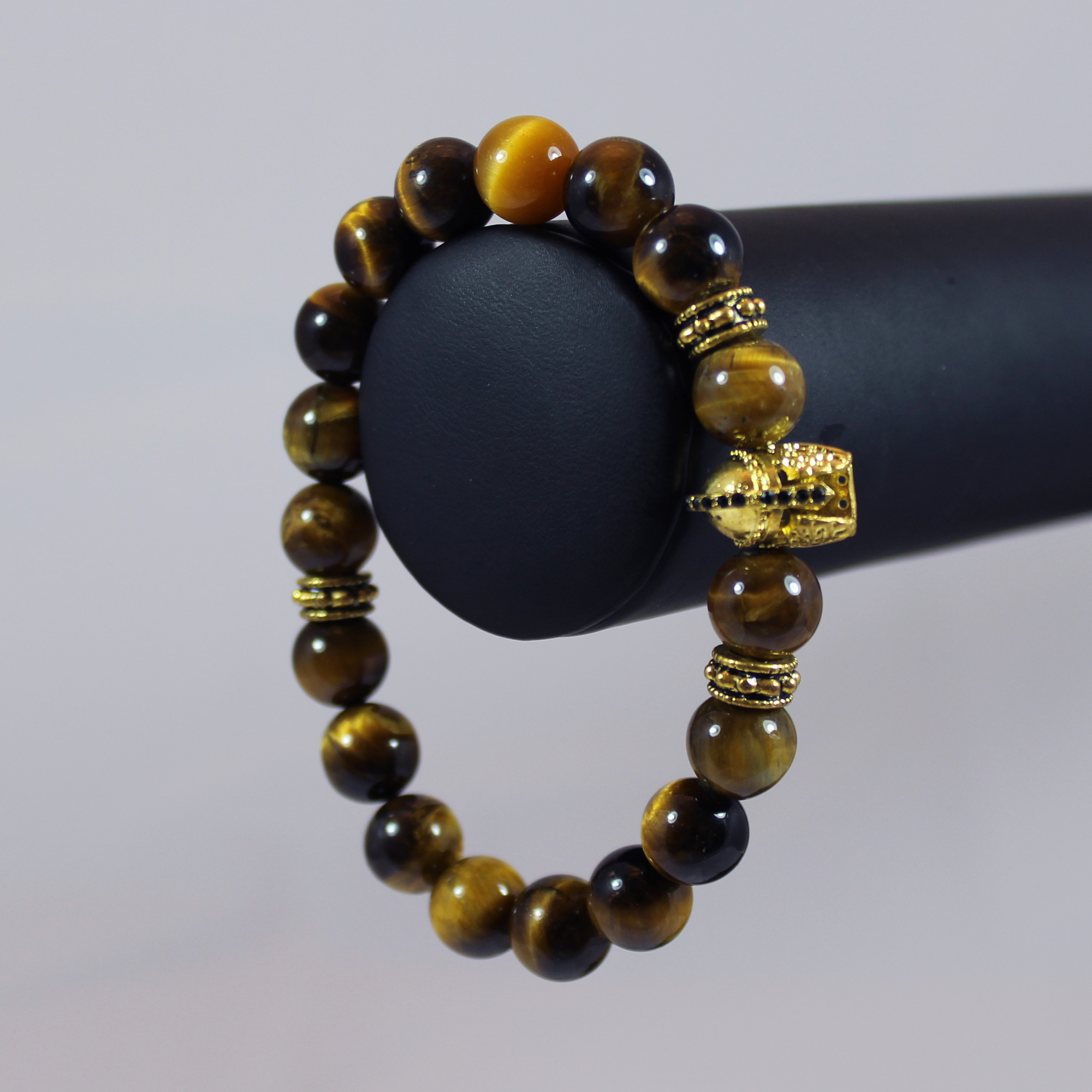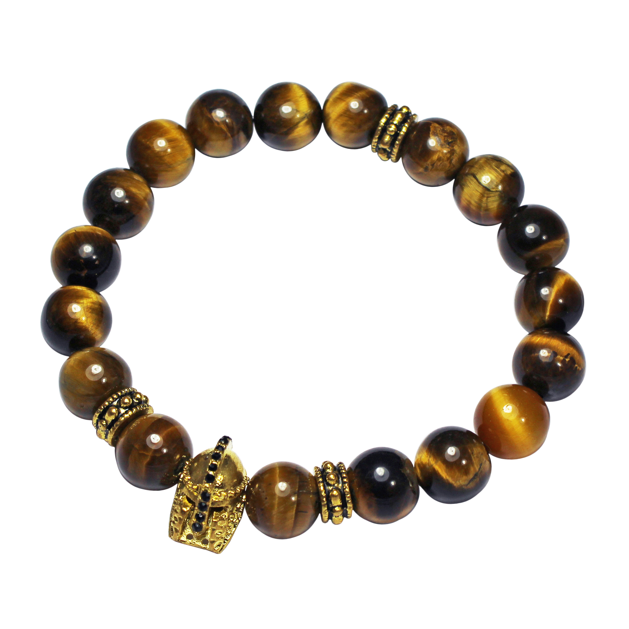 10mm tiger eye beads, gold spacers, gold black rhinestone trojan helmet.