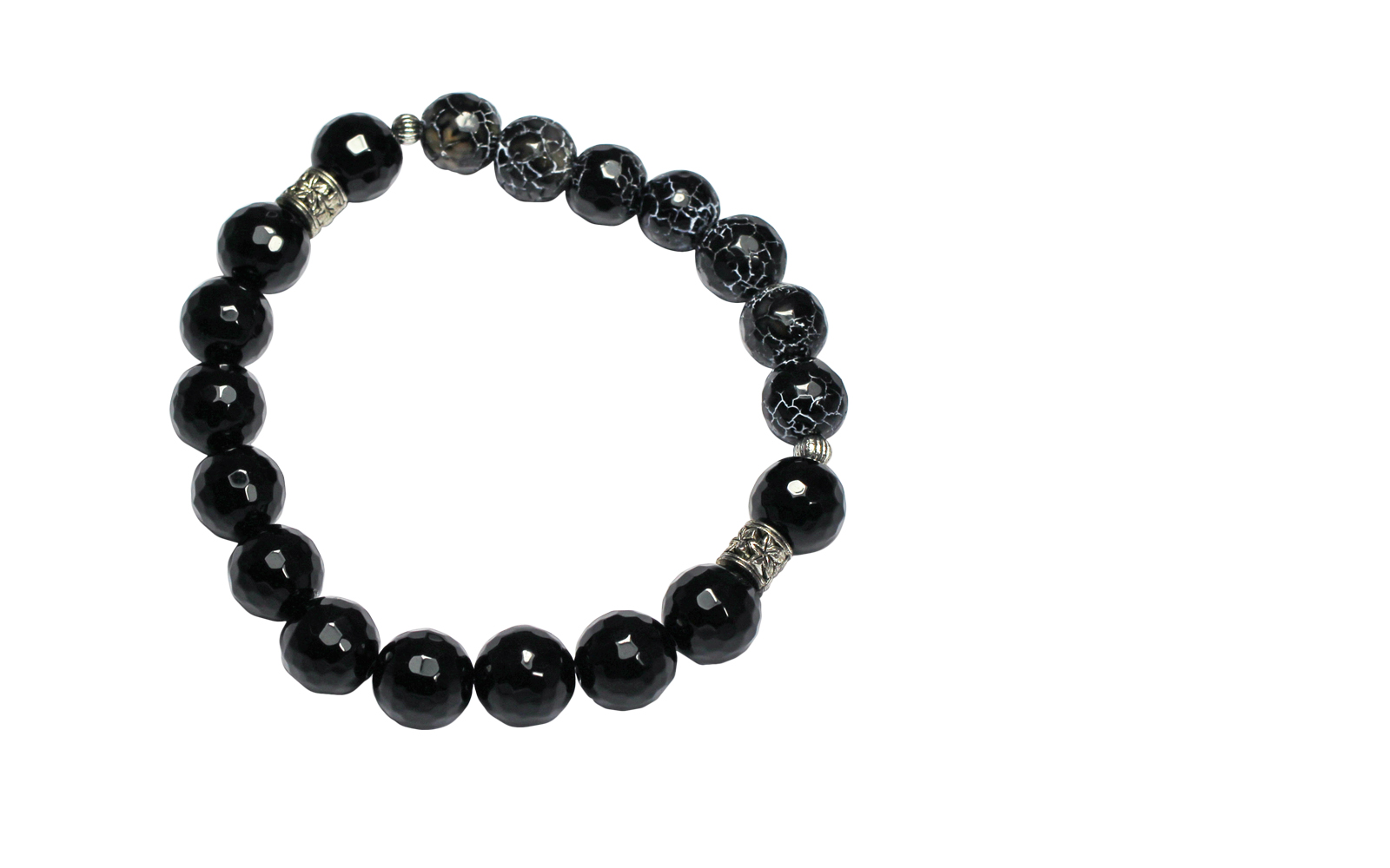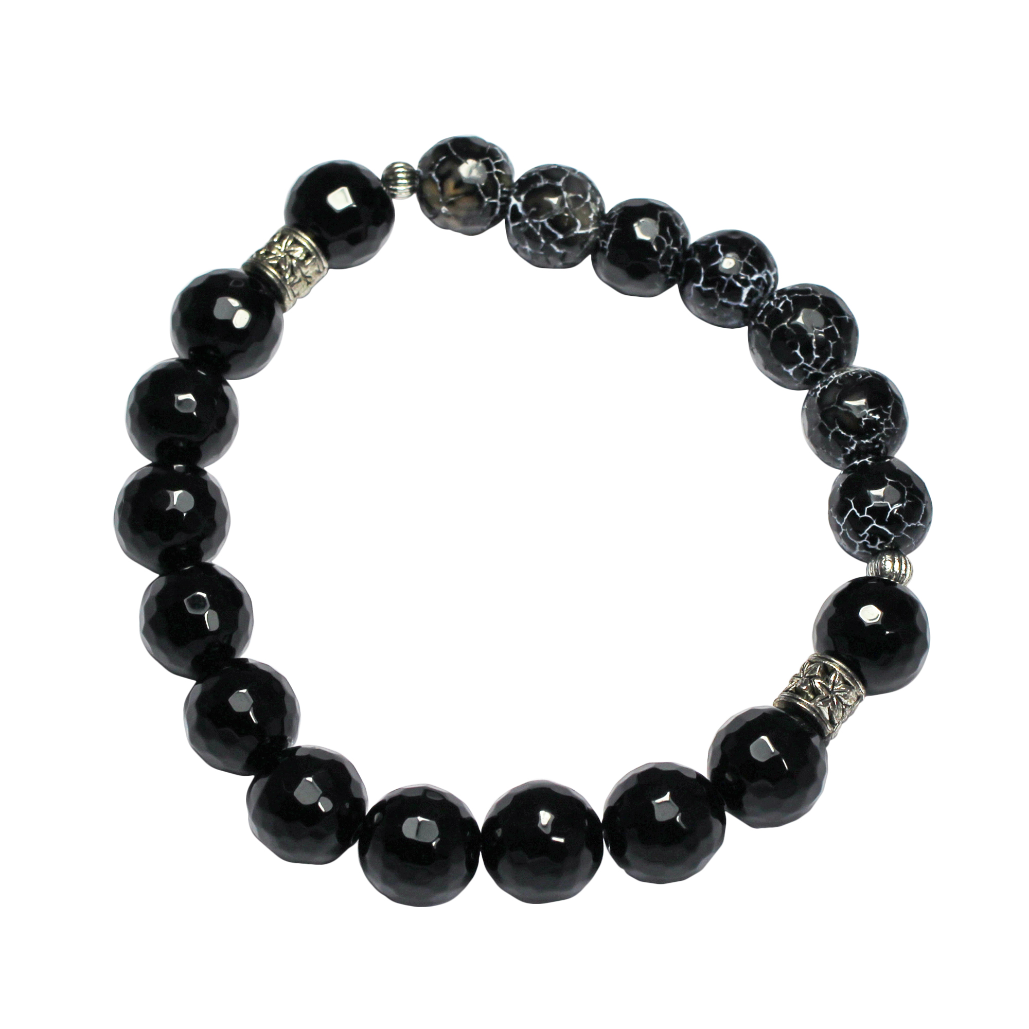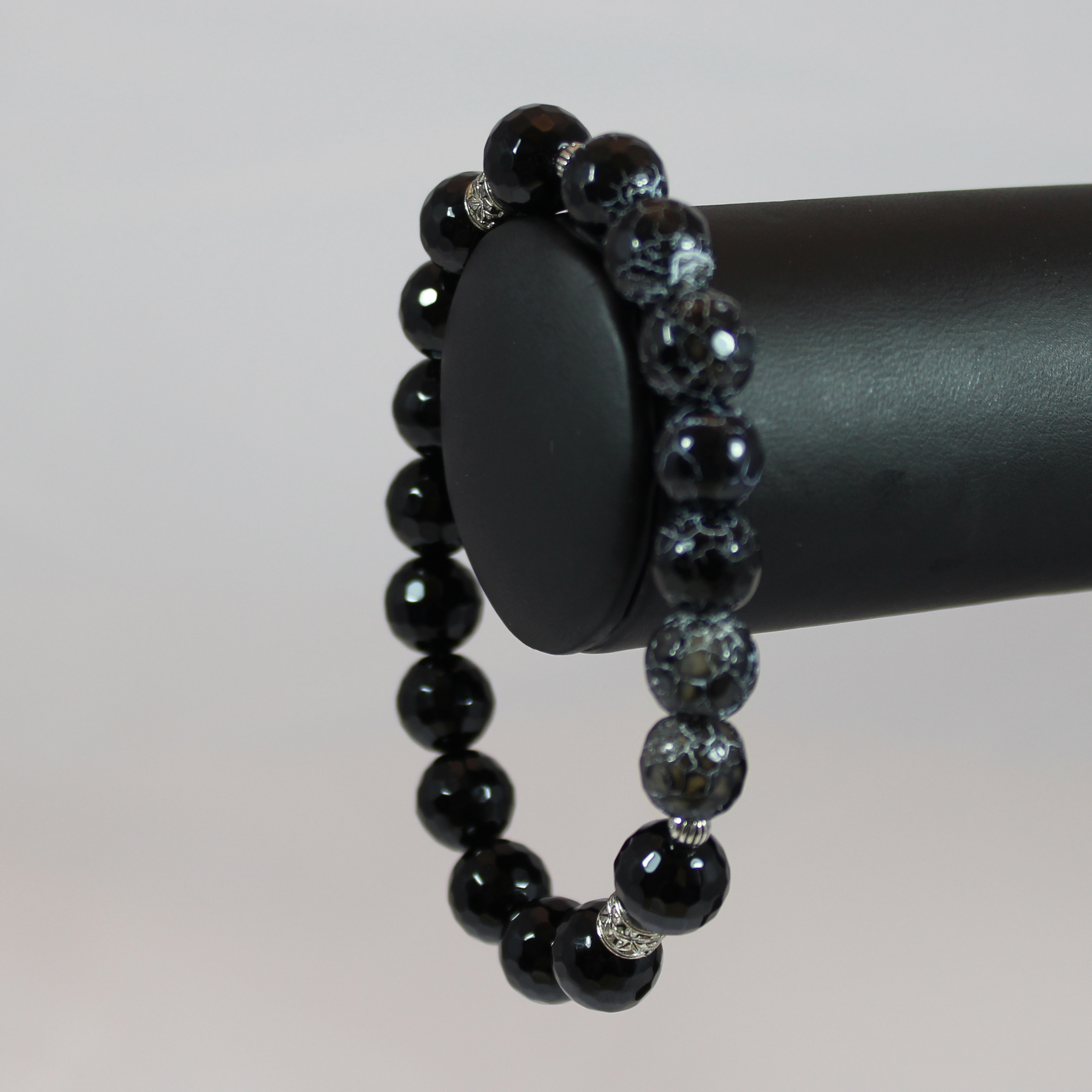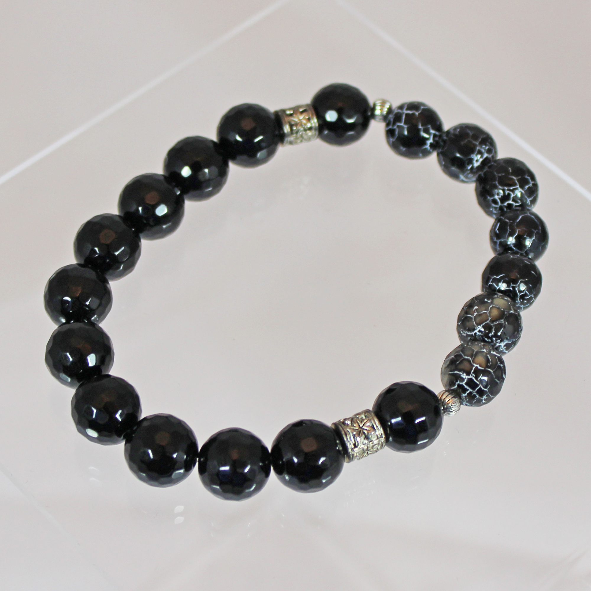 10mm black faceted agate beads, 10mm black stripe agate faceted beads, silver findings.