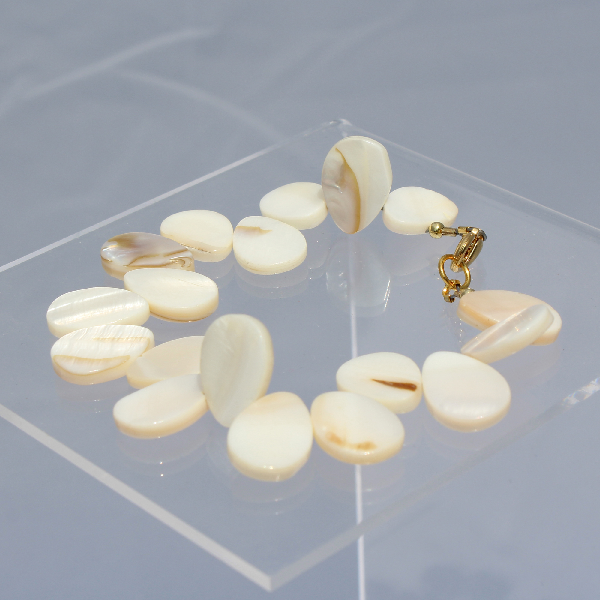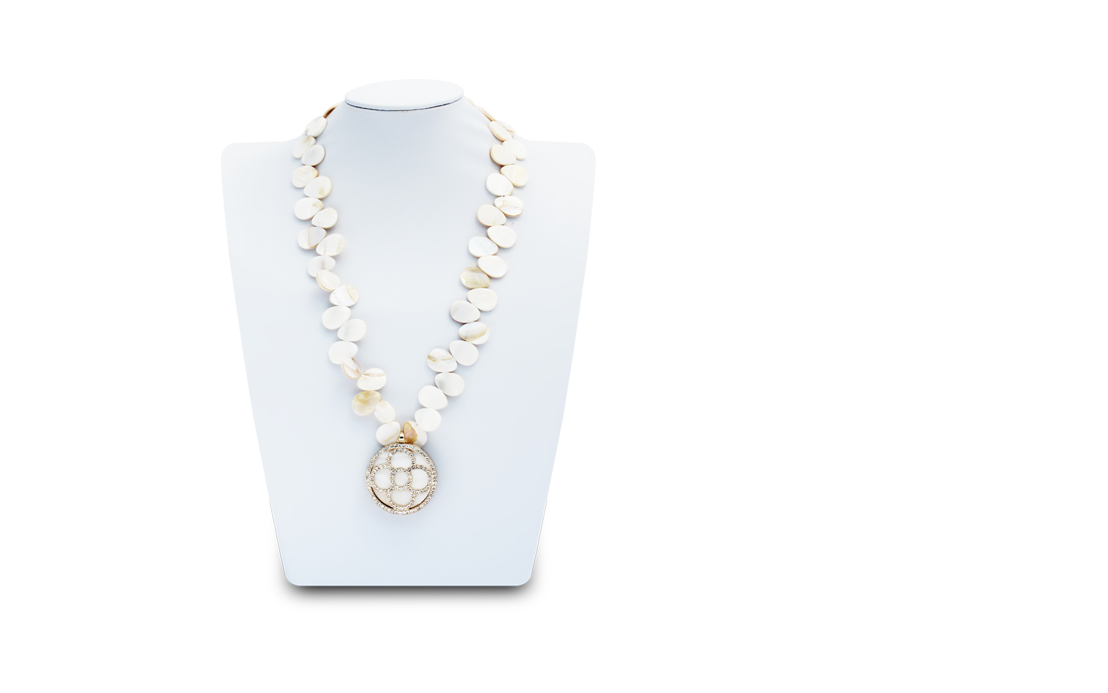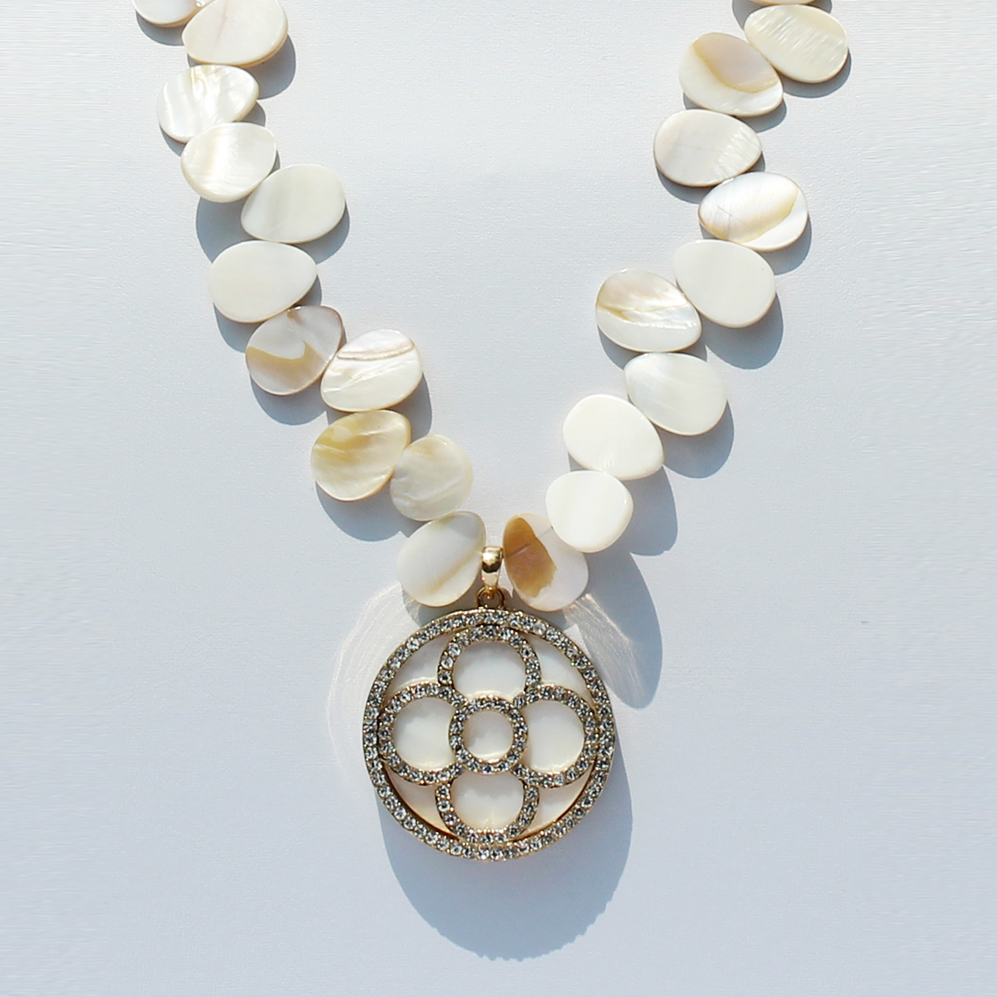 Mother of pearl shell beads, gold rhinestone mother of pearl pendant, gold lobster clasp.