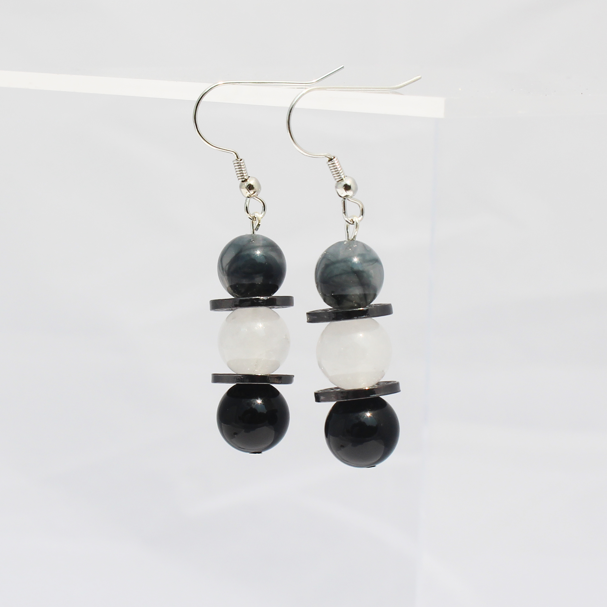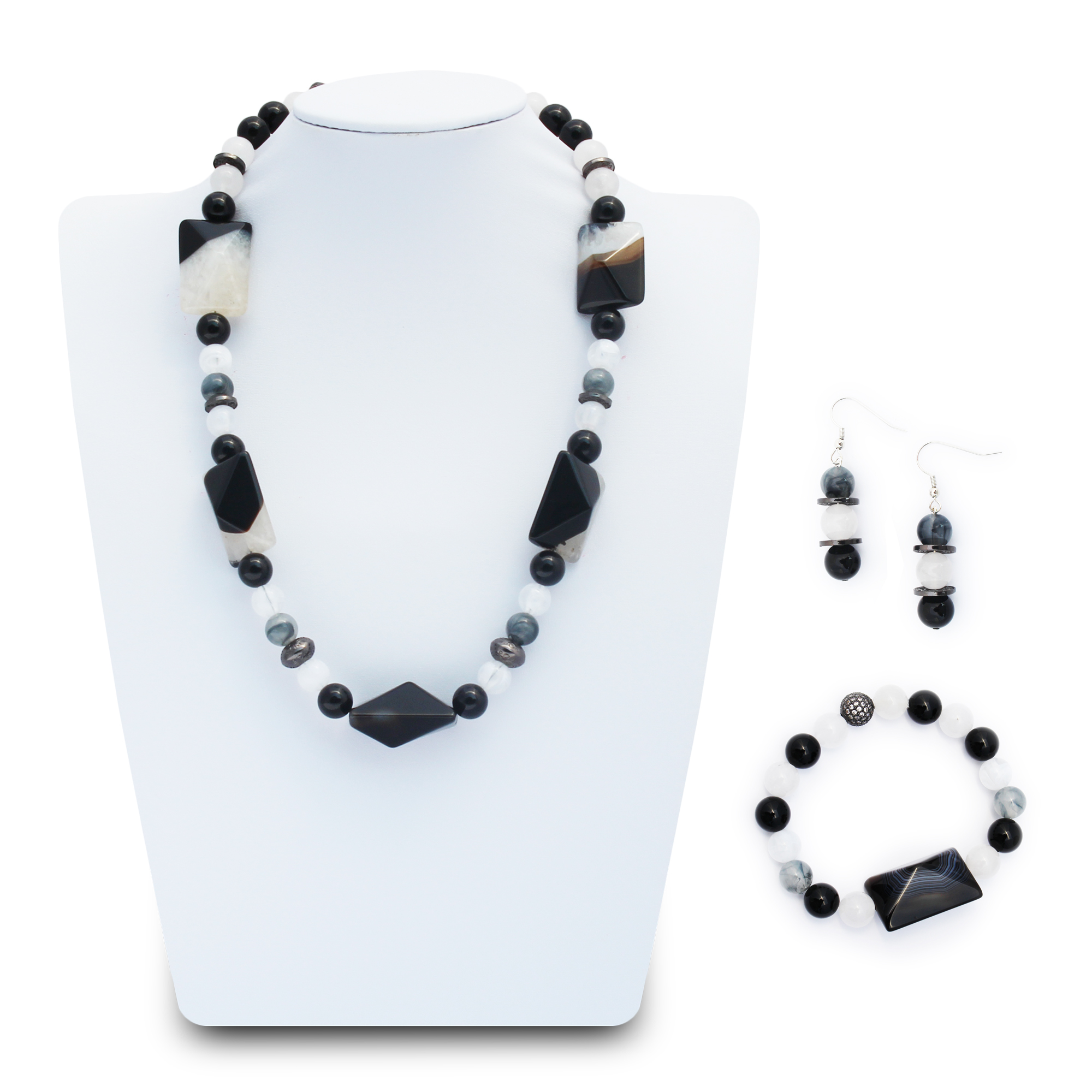 10mm black onyx beads, 10mmwhite jade beads, hematite spacers, black/white agate pyramid shape beads, pave bead, silver lobster clasp.