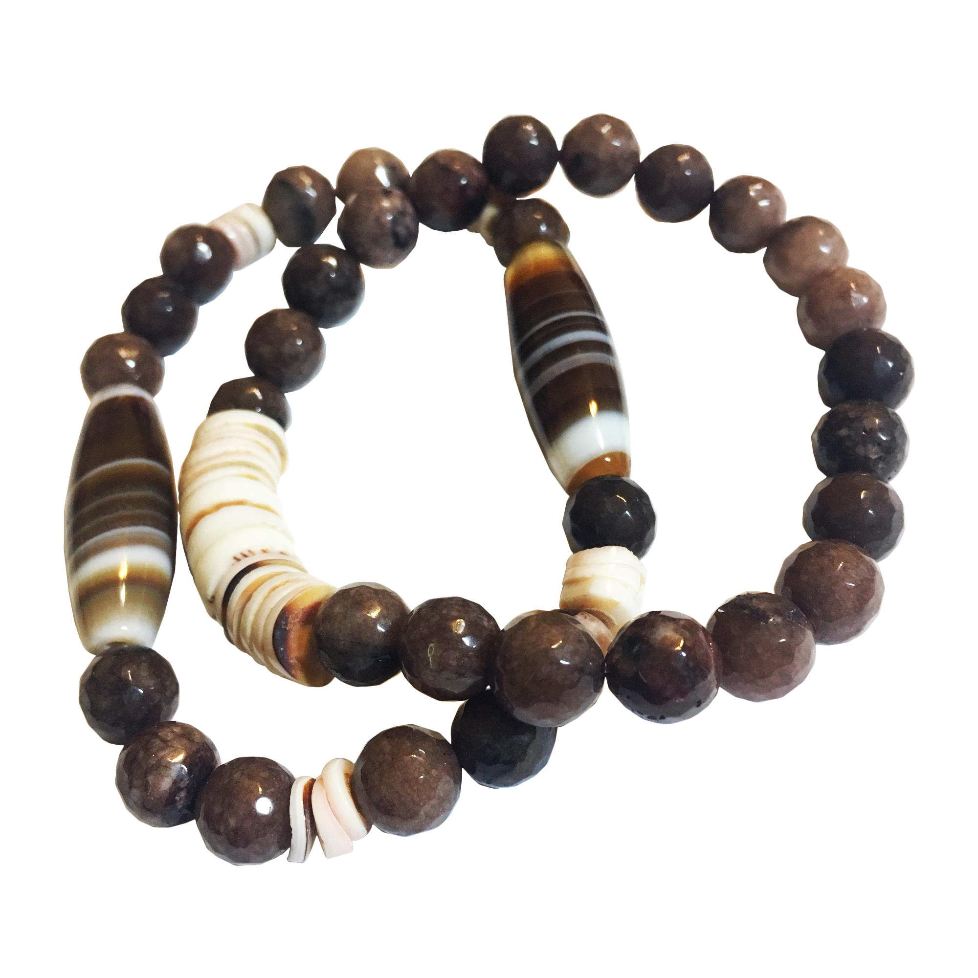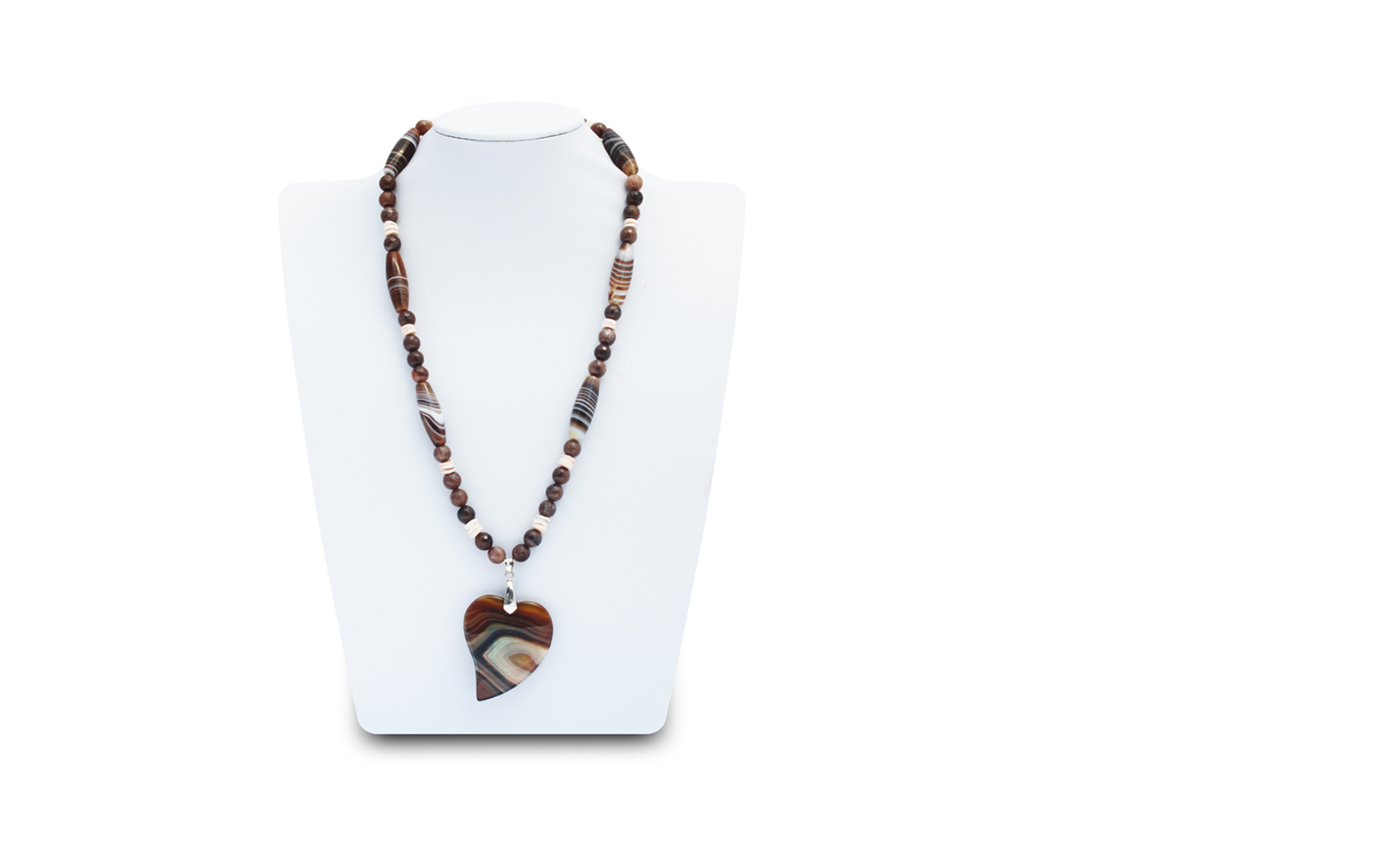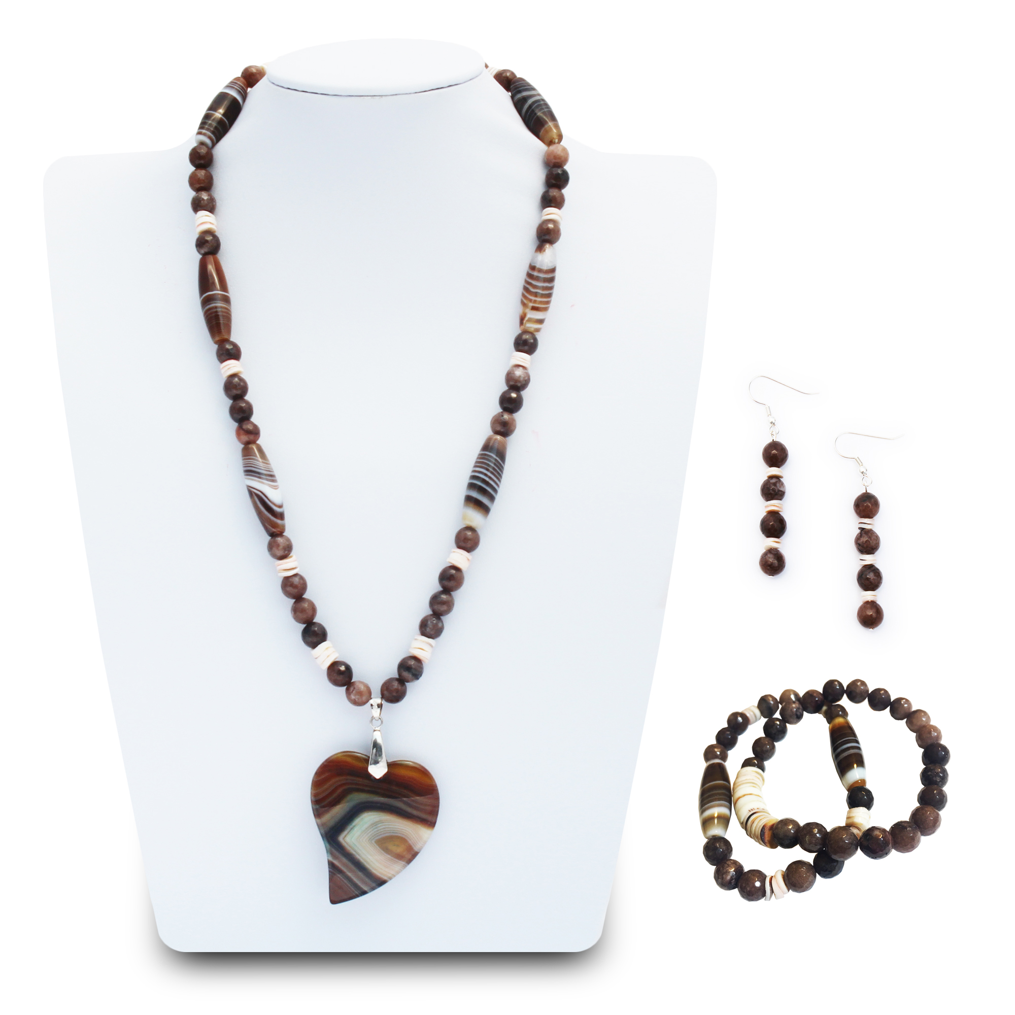 8mm facet jasper beads, brown stripe tubular agate beads, coconut shell beads, brown stripe agate heart pendant, silver magnet clasp.